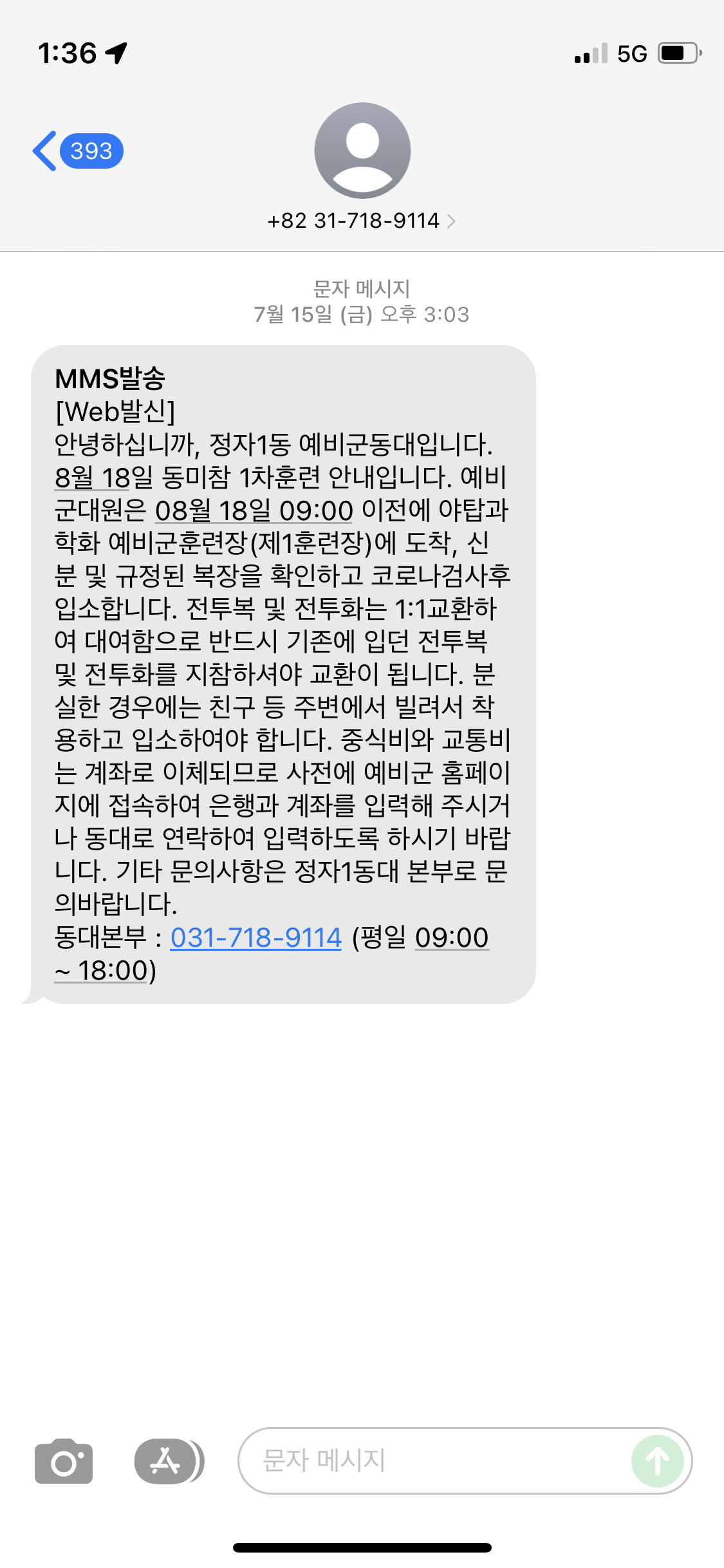 7월 15일에 문자를 받고 8월 18일에 동미참 1차훈련을 진행했습니다.