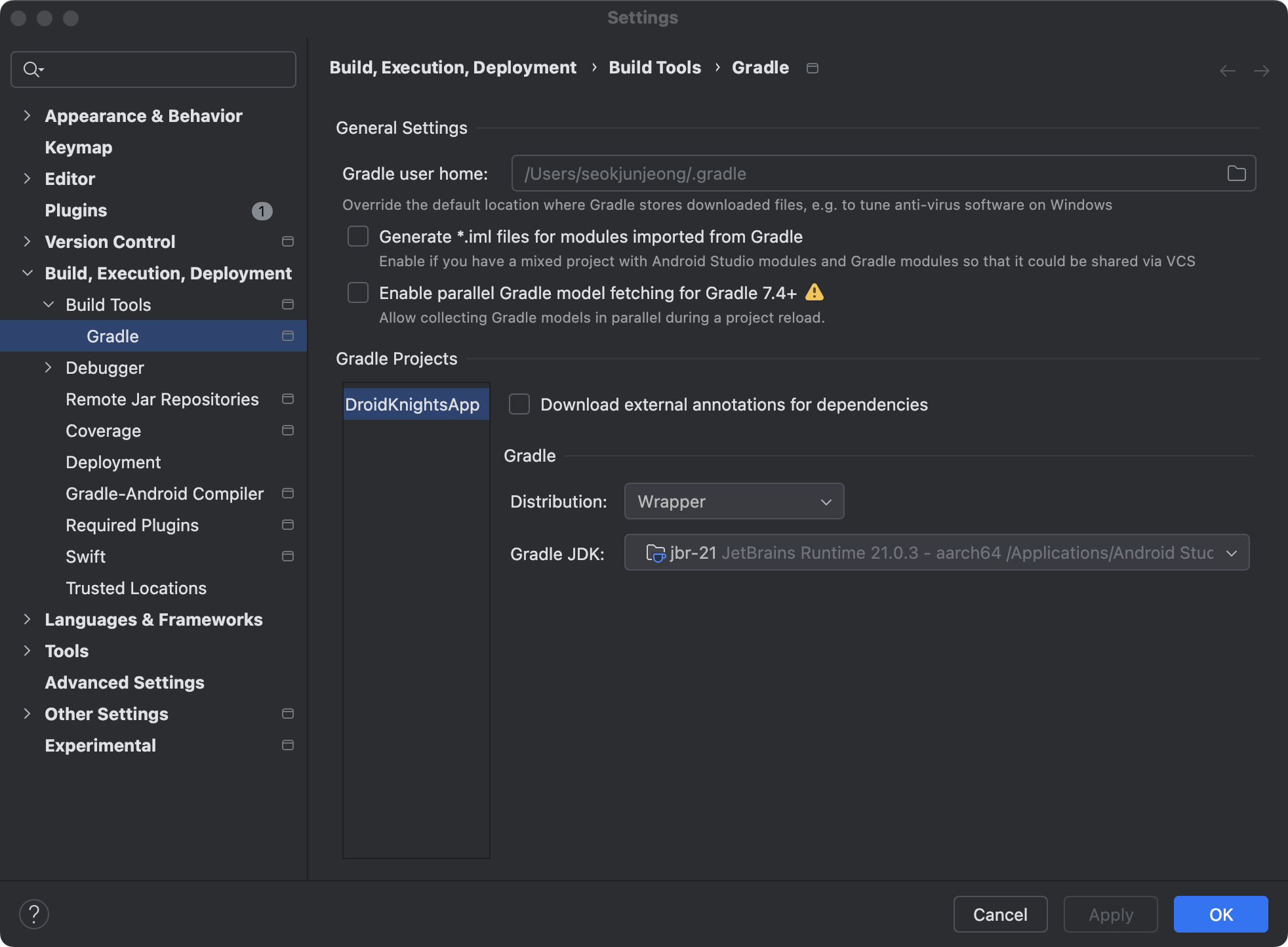 현재 Android Studio에서 Gradle JDK 설정을 보니 버전이 21로 되어있었고 이게 맞지 않아서 발생한 에러였다.