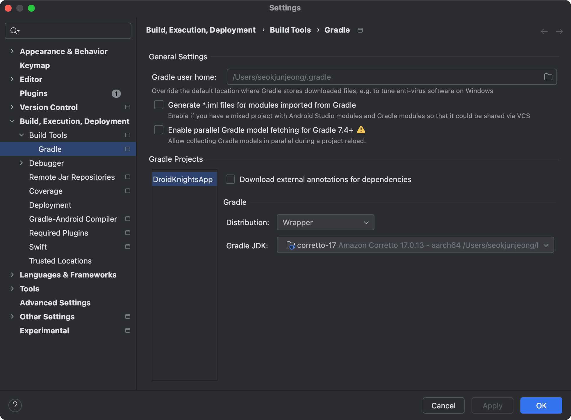 여기 있는 Gradle JDK를 17버전으로 맞춰서 변경해주면 에러는 해결된다.