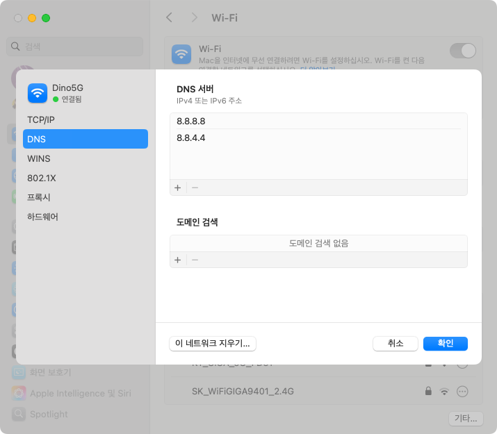 Mac 환경이 아닌 Window 환경에서도 동일한 문제가 발생할 수 있는데 똑같이 DNS설정을 해주면 해결 될 것이라 생각된다.